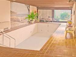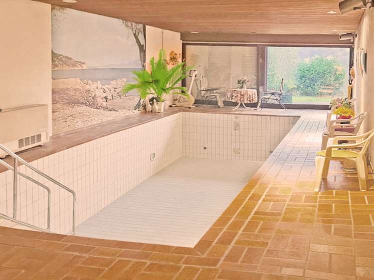 - Zugang zur Indoor Schwimmhalle mit Pool, Dusche, Sauna und Umkleideraum, Schiebetüren-Fensterfront zum Gartenbereich