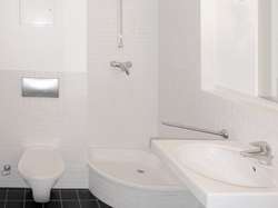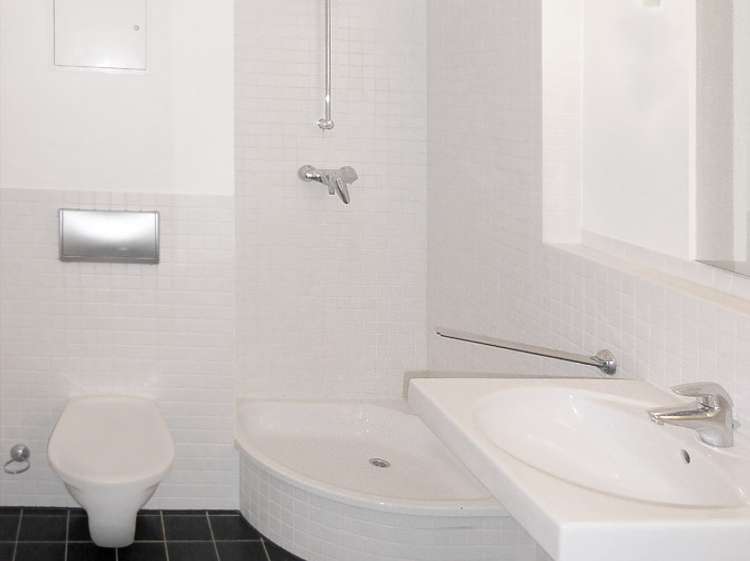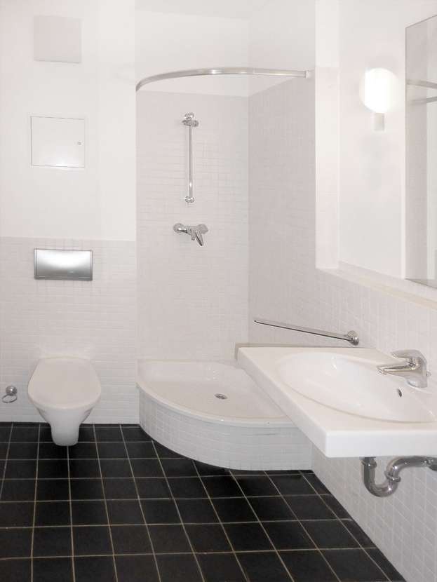 - Hell gefliestes Badezimmer mit Dusche