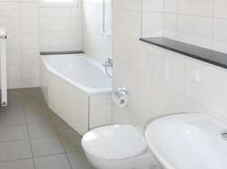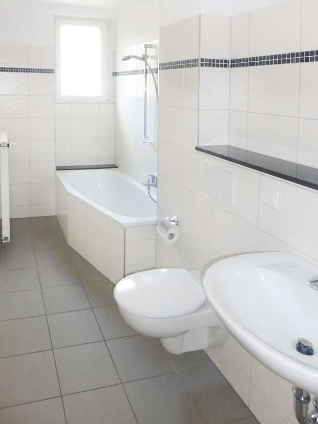 - Hell gekacheltes Tageslichtbad mit Wanne