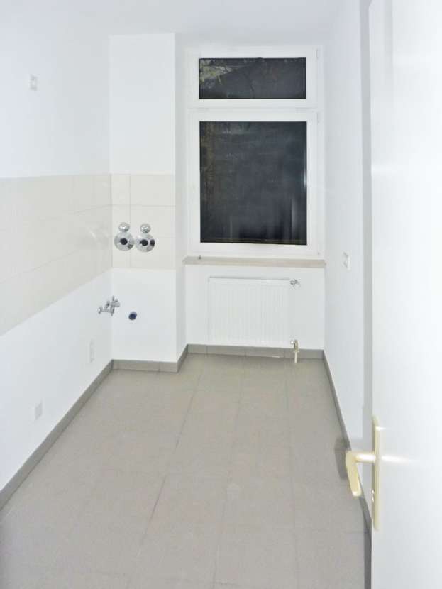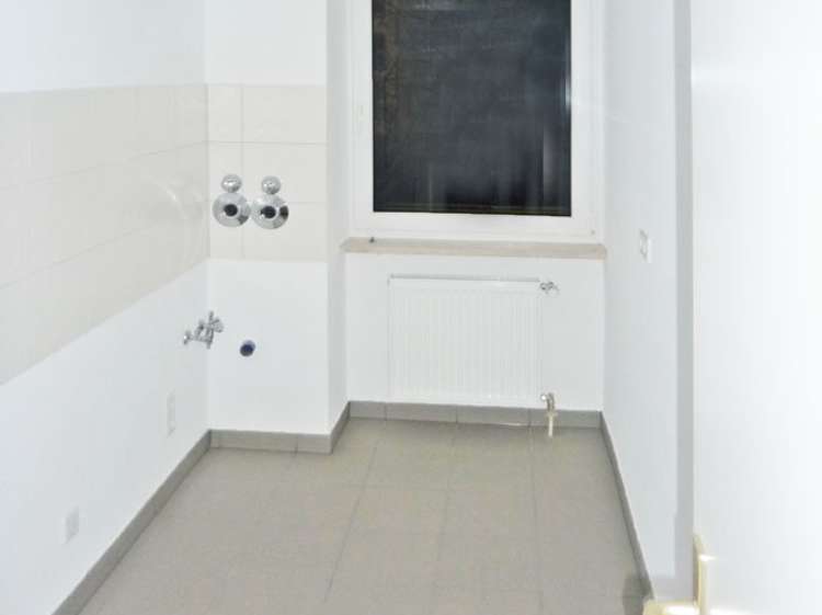 - Hell gekachelte Küche mit anthrazitfarbenem Fliesenboden; unser Angebot beinhaltet keine Einbauküche und kann daher individuell von Ihnen ausgestattet werden