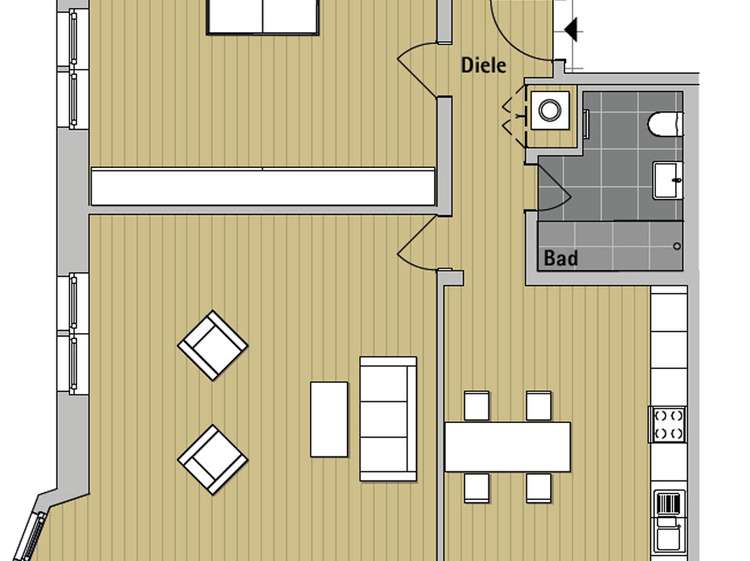 Bitte beachten Sie: eines der 3 Zimmer beinhaltet die integrierte Einbauküche und den Essbereich.